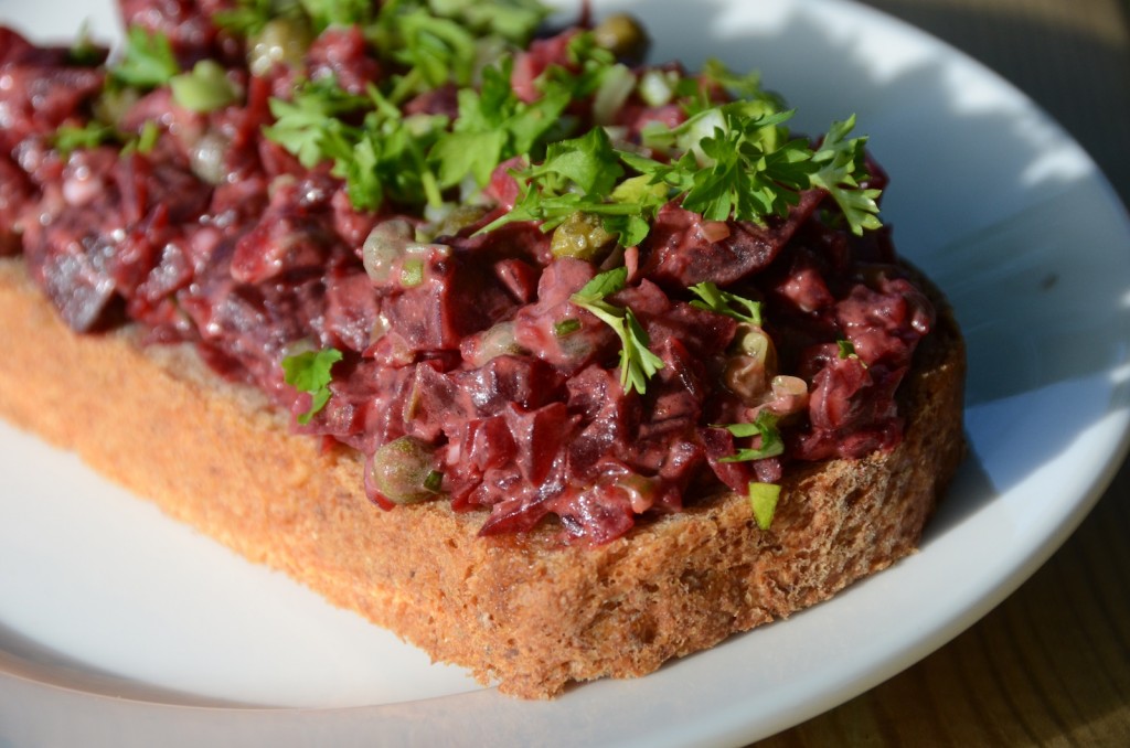 Hak de bieten met een mes tot de consistentie van tartaar.